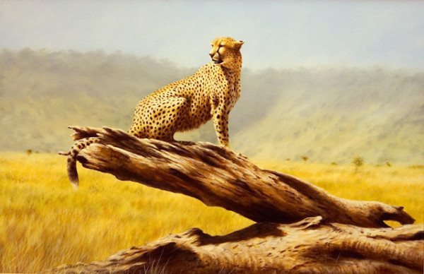 Cheetah is an oil on canvas, The Cheetah in the painting is using the dead tree as a vantage point to survay the grasslands of the Masai Mara, for not only it's next meal but other predators that might be a threat.